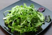 Świeży zielony sałatka w misce na drewnianym stole z bliska