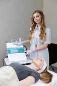 Uśmiechnięta młoda dama przechodzi zabiegi przeciw starzeniu się w klinice kosmetycznej. Koncepcja profesjonalnej kosmetologii i odmłodzenia