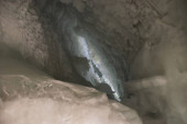 Zbliżenie grubych, turkusowych formacji lodowych i zamarzniętych fal tworzących małą jaskinię lodową na skalistym brzegu jeziora Vnern w Szwecji podczas głębokiego zamarzania w sezonie zimowym.