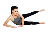 Kobieta robi rozciągające ćwiczenia przeciwko biały