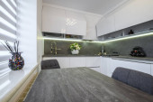 Zdjęcie "Nowoczesne meble kuchenne z błyszczącymi białymi drzwiami, meble na zamówienie, remont mieszkania, drewniany blat, białe szafki, nowoczesny wystrój, projektowanie mebli kuchennych" może być wykorzystywane do celów osobistych i komercyjnych zgodnie z warunkami zakupionej licencji Royalty-free. Obraz jest dostępny do pobrania w jakości wysokiej rozdzielczości do 5760x3840.