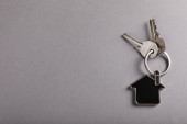 Zestaw kluczy wisi na breloczku w kształcie domu. Drewniana powierzchnia poniżej nadaje scenie rustykalnego charakteru. Obraz ten pokazuje codzienne przedmioty, z którymi ludzie wchodzą w interakcje..