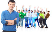 młoda kobieta z duża grupa młodych uśmiechający się studentów. nad