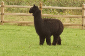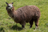 Widok brązowych futrzastych lamy wypasanych na łące na farmie w Ekwadorze