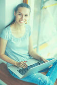 Szczęśliwa młoda kobieta piękne z laptopa pomieszczeniu