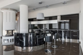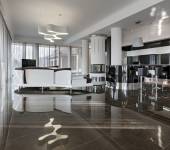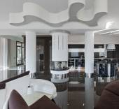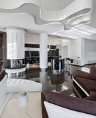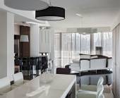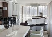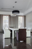Nowoczesne wnętrza, duży stół, krzesła i salon w daylig