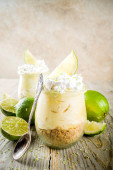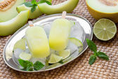 Domowej roboty lizak awokado. Wegańskie lody nie-mleczne. Awokado, wapno i kokos zdrowy lizak na szarym kamiennym tle ze świeżymi plastrami wapna, awokado i lodem
