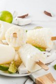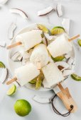 Zdjęcie "Domowej roboty lizak awokado. Wegańskie lody nie-mleczne. Awokado, wapno i kokos zdrowy lizak na szarym kamiennym tle ze świeżymi plastrami wapna, awokado i lodem" może być wykorzystywane do celów osobistych i komercyjnych zgodnie z warunkami zakupionej licencji Royalty-free. Obraz jest dostępny do pobrania w jakości wysokiej rozdzielczości do 5760x3840.