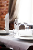 Elegancka serwetka składana z dekoracyjnym wzorem umieszczona na stole we wnętrzu restauracji. Gustowna oprawa jadalna z okularami i ciepłym oświetleniem otoczenia.