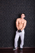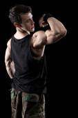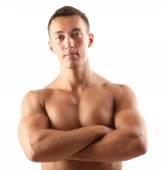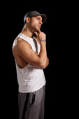 muskularny mężczyzna z ramionami skrzyżowanymi. łapka na czarno.