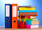zasobniki papieru jasne i papeterii na drewnianym stole na niebieskim tle