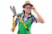 Młody wesoły ogrodnik z podlewaniem może izolować się na białym