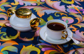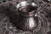 Cooper turkish Cezve with fresh coffee drink on tablecloth