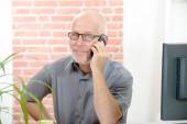 Połowie wieku biznesmen siedzi przy biurku rozmowy na telefon komórkowy