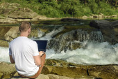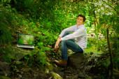 Młody przystojny mężczyzna z wielkim łączność z Internetem w lesie dżungli