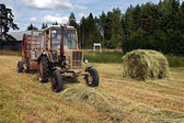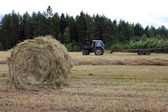 Rolnikowi ciągnika z prasa wypluwa okrągłych rolkach siana.