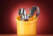 sztućce kuchenne, noże, widelce, łyżki w żółty stoiska z różowy serwetka