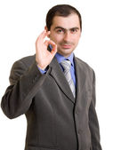 sukcesy biznesmen gest pokazuje dobrze na białym tle.