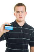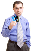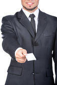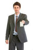biznesmen z pilota zdalnego sterowania na białym tle.
