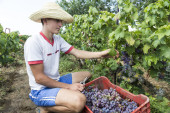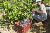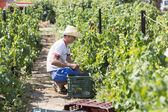 Zagroda pracownik zbioru winogron podczas zbiorów w Saloniki, Greece