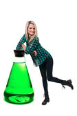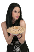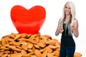 kobieta siedzi na czerwony pyszne jabłko z etykiecie odżywiania