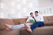 romantyczna, zrelaksowana młoda para w nowoczesnym domu za pomocą tabletu