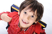 zadowolony ładny chłopiec bez zębów przednich, przygotowane do szkoły