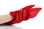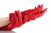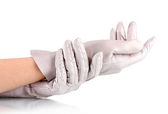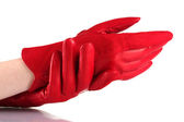 Kobiet w ręce w czarne skórzane rękawice na białym tle