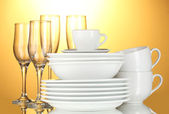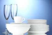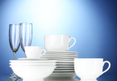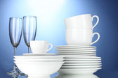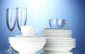 puste miski, talerze, kubki i szklanki na niebieskim tle