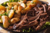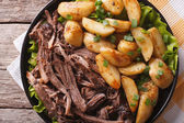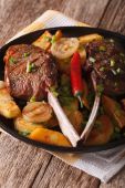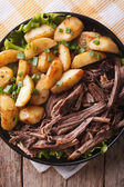 Wyciągnął wieprzowina i pieczone ziemniaki z bliska na stole. pionowe