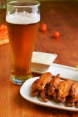Szklanka piwa i kurczaka skrzydła na ciemnym tle drewniane