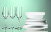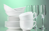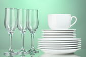 czyste talerze, kubki i szklanki na zielonym tle