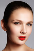 Fashion model girl portrait with long blowing hair. Glamour beautiful woman with healthy and beauty brown hair. Hair cosmetics, haircare. Hair care, extensions.