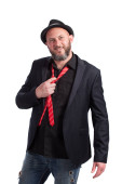 Młody człowiek z kapelusz i broda grać na gitarze elektrycznej z entuzjazmem. Na białym tle