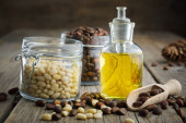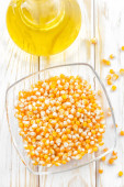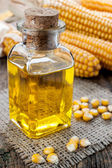 Butelka olejku kukurydza, nasiona w misce i dwa corncobs