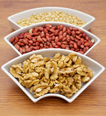 biały Ratuszowego orzechy, orzeszki ziemne i cedrowe na białym tle drewniane