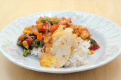 Tajskie jedzenie, smażone krewetki w sosie czarny pieprz.