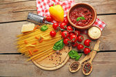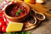 Makaron penne z pomidory, sos bolognese, ser i bazylia na rustykalne drewniane tła