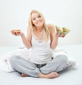 pokusie, młoda kobieta, wyborem żywności