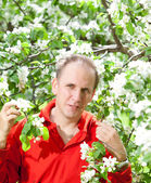 Młoda atrakcyjna kobieta stoi w pobliżu kwitnących jabłoni