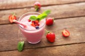 Świeży Jogurt Truskawkowy z jagody wokół na drewniane tła