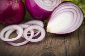Czerwona cebula koła, zielona cebula z czosnkiem na pokładzie drewnianym tle