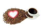 Sercem? z ziaren kawy wokół filiżankę kawy na w