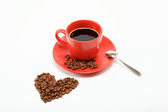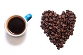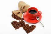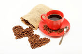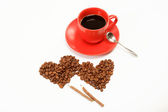 Dwa serca wykonane? z ziaren kawy wokół filiżankę kawy o