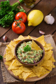 Guacamole awokado, wapno, pomidor, cebula i kolendry, serwowane z nachos