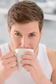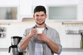 Zdjęcie "Człowiek z kubek napój w kuchni." może być wykorzystywane do celów osobistych i komercyjnych zgodnie z warunkami zakupionej licencji Royalty-free. Obraz jest dostępny do pobrania w jakości wysokiej rozdzielczości do 5760x3840.
