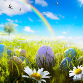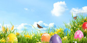 sztuka pisanki zdobione kwiatami w trawie na błękitne niebo