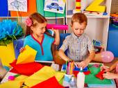 Dzieci trzymanie kolorowego papieru i kleju na stole w przedszkolu .