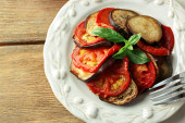 Zdjęcie "Ratatuj na talerzu, na tle tabeli" może być wykorzystywane do celów osobistych i komercyjnych zgodnie z warunkami zakupionej licencji Royalty-free. Obraz jest dostępny do pobrania w jakości wysokiej rozdzielczości do 5760x3840.