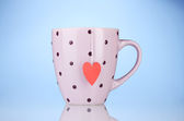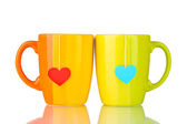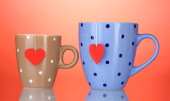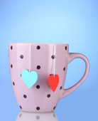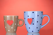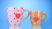 dwie szklanki i torebki herbaty z czerwony i niebieski-serce etykiety na niebieski backgrou